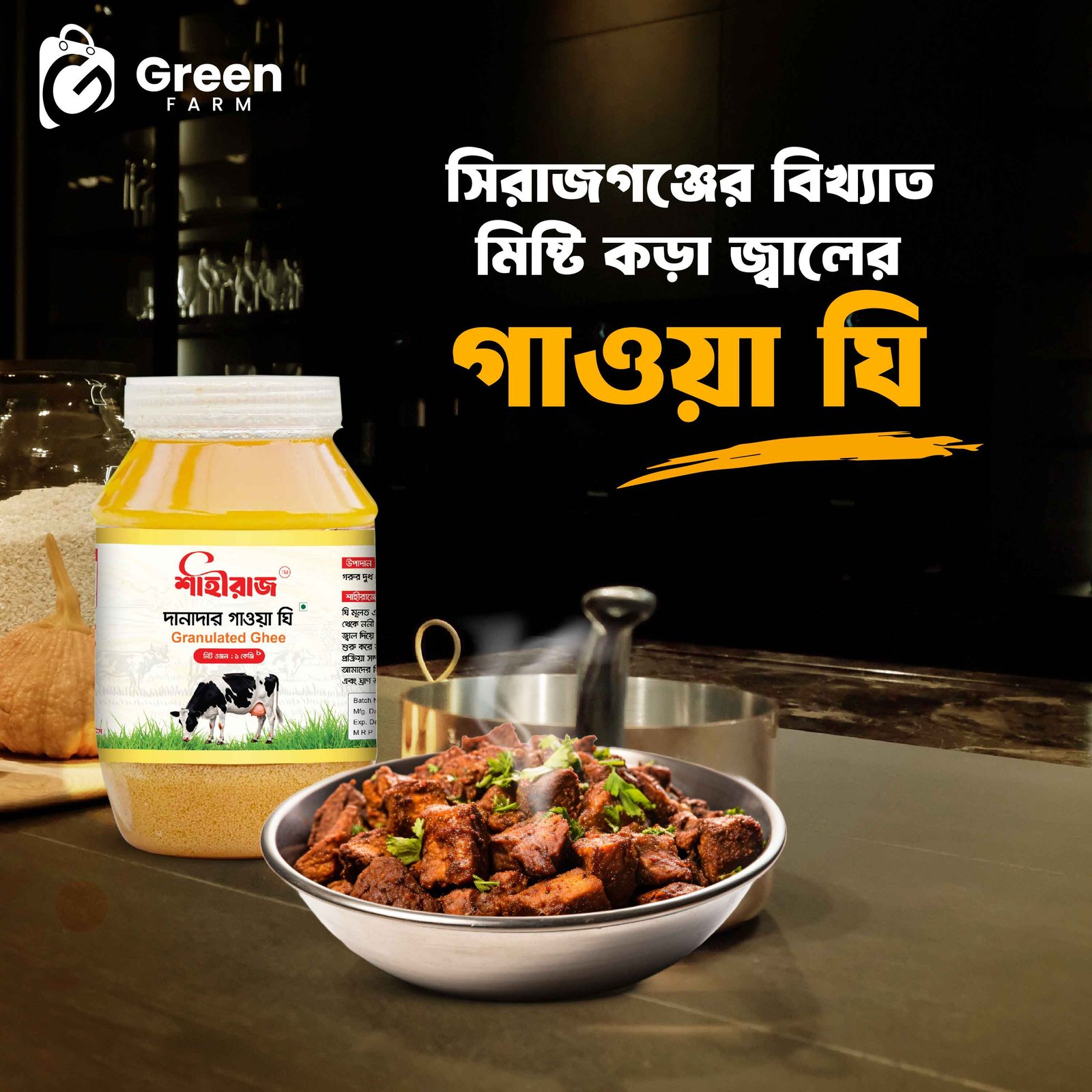 এই গাওয়া ঘি রান্না, ভাজা, পোলাও ও মিষ্টান্নে অতুলনীয় স্বাদ যোগ করে। নিয়মিত পরিমিত ব্যবহারে এটি শরীরকে প্রয়োজনীয় স্বাস্থ্যকর ফ্যাট সরবরাহ করে এবং হজমশক্তি বাড়াতে সহায়ক। যারা ভেজালমুক্ত, নিরাপদ ও বিশ্বাসযোগ্য ঘি খুঁজছেন, তাদের জন্য Green Farm খাঁটি গাওয়া ঘি একটি নির্ভরযোগ্য পছন্দ।